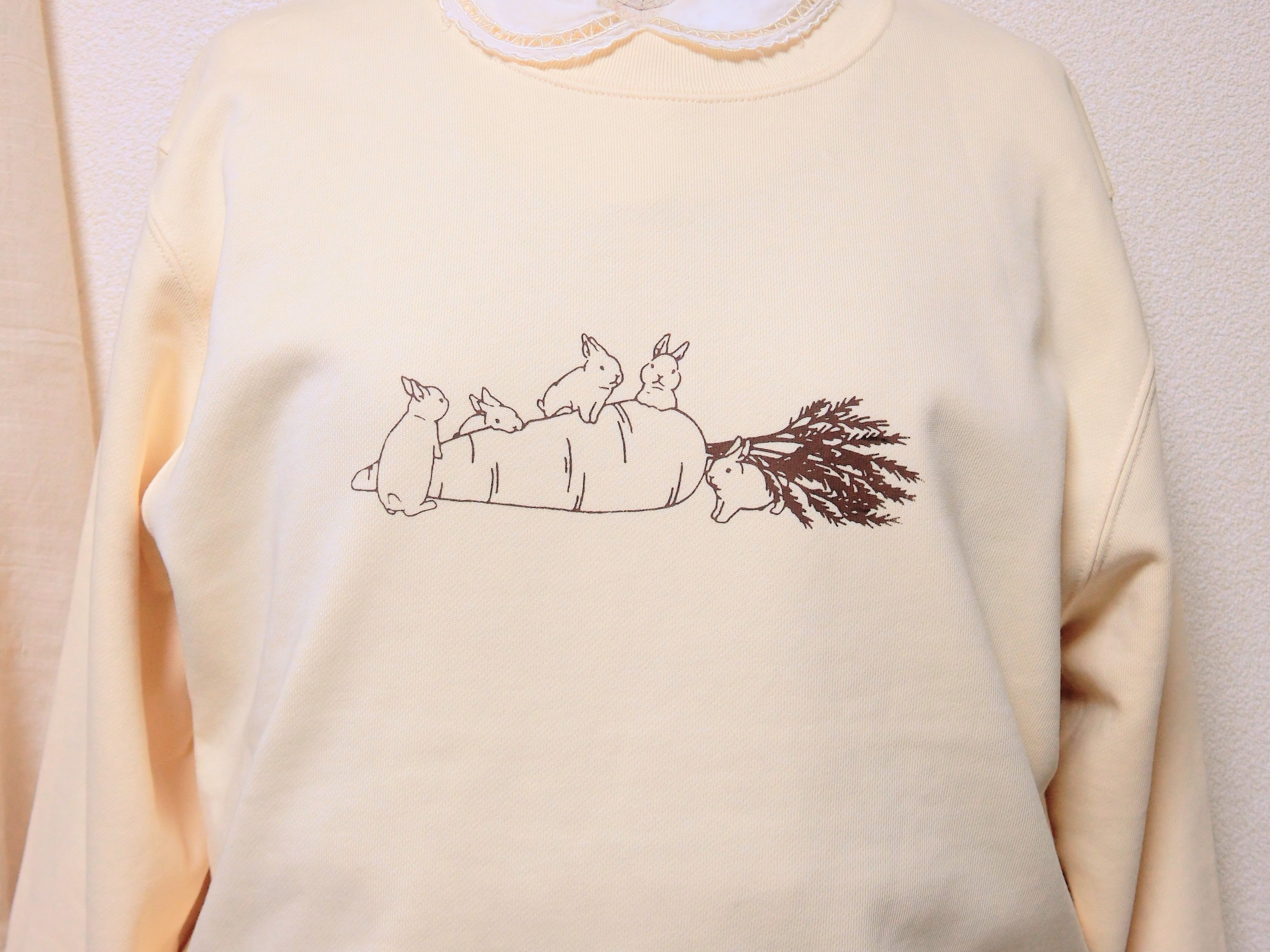 クリーム色の10オンスのクルーネックスウェットに、大きなにんじんと、そのまわりで遊ぶうさぎさんたちを、茶色のインクでシルクスクリーンプリントしました。
