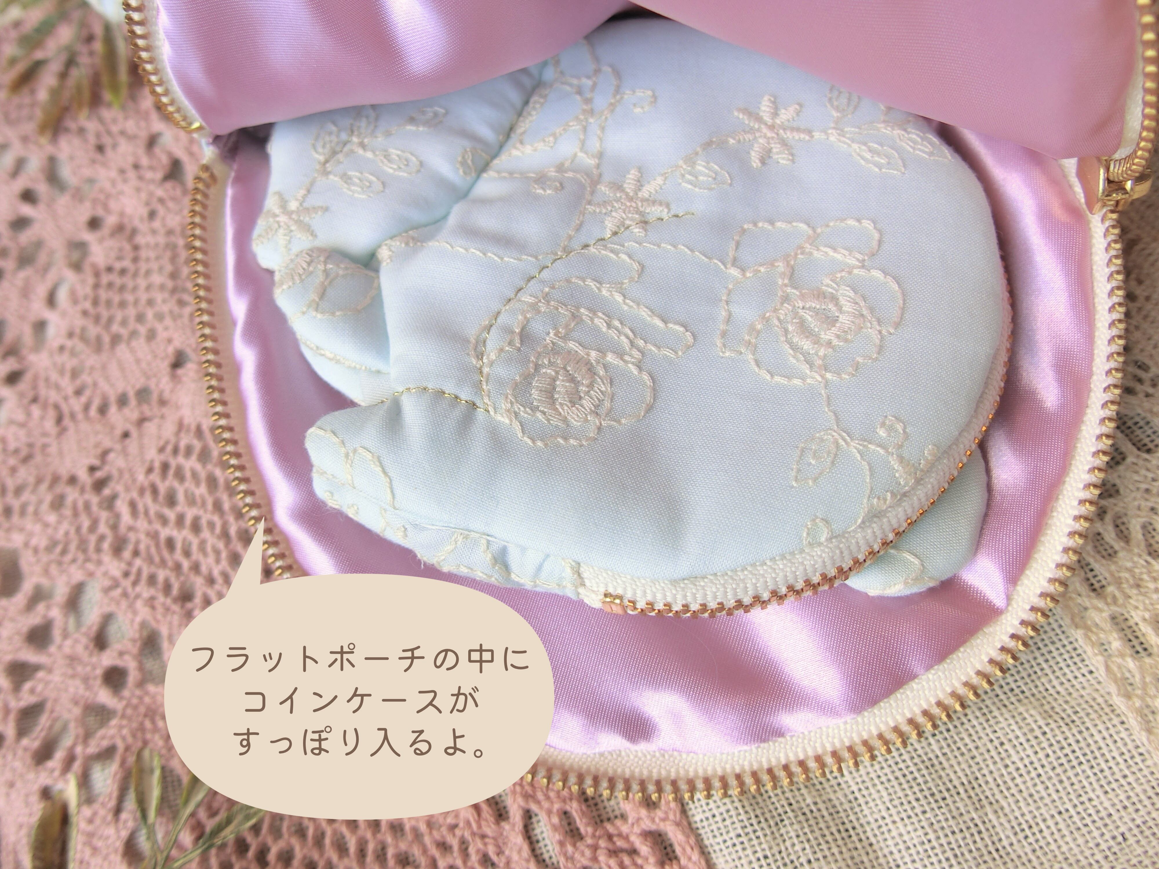 ナチュラルな花柄の刺繍生地に、ツヤツヤのサテン生地がオシャレなポーチです。